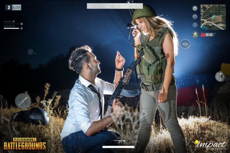 The photos, shot by Impact Photography, include several elements of PUBG. The groom wore a white chemise with black tie similar to the character on the cover of the game. The bride, meanwhile, was clad the signature PUBG bulletproof vest and helmet. They both were holding rifles found in the game as well. In the background, we can see the grassland of the Erangel map and the airdrop crate. The game’s interface, including the minimap, healthbar, number of players alive, compass, and on-screen control buttons have been photoshopped into the pictures as well.